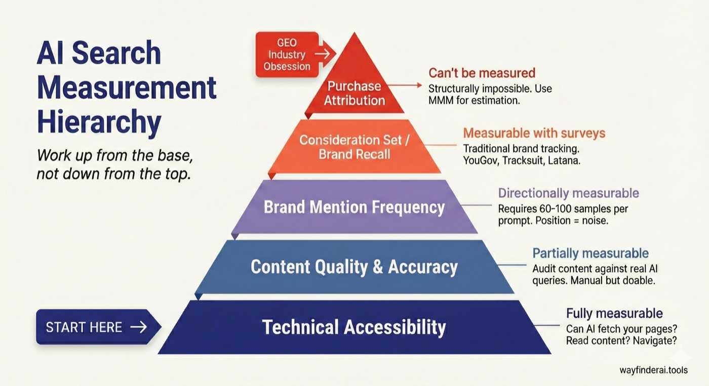 The GEO industry is obsessed with Level 5, the one thing that's structurally impossible. Meanwhile, most brands haven't even confirmed Level 1: can AI actually access their content at all? The smart approach is to work up from there not down from Level 5. Fix the foundation first. Then worry about the stuff that's harder to measure.